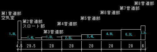 The image image in the plan is published like being comprehensible the outline of the sound road structure of the backing loading of the Nagaoka [tetsuotoko] teacher. A white capacity of each sound road part (unit liter), dimension line shows the length of the sound road (unit centimeter) in showing in light blue.